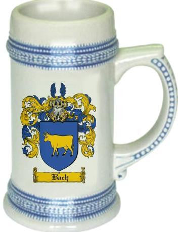 Bach Family Crest Stein / Coat of Arms Beer Tankard. We believe our Coat of Arms Steins are of the highest quality anywhere. The glassware quality is very thick and sturdy. The stein feels great in your hand with a very thick handle. Fill this glass with your favorite beer or beverage. keywords: steins, beer, german, glass, glassware, cup, tankard, goblet, family shields, shield, family, genealogy, heraldry, code of arms