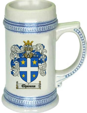 Chavana Family Crest Stein / Coat of Arms Beer Tankard. We believe our Coat of Arms Steins are of the highest quality anywhere. The glassware quality is very thick and sturdy. The stein feels great in your hand with a very thick handle. Fill this glass with your favorite beer or beverage. keywords: steins, beer, german, glass, glassware, cup, tankard, goblet, family shields, shield, family, genealogy, heraldry, code of arms