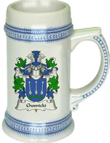 Chosnicki Family Crest Stein / Coat of Arms Beer Tankard. We believe our Coat of Arms Steins are of the highest quality anywhere. The glassware quality is very thick and sturdy. The stein feels great in your hand with a very thick handle. Fill this glass with your favorite beer or beverage. keywords: steins, beer, german, glass, glassware, cup, tankard, goblet, family shields, shield, family, genealogy, heraldry, code of arms