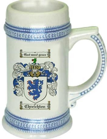 Chreichton Family Crest Stein / Coat of Arms Beer Tankard. We believe our Coat of Arms Steins are of the highest quality anywhere. The glassware quality is very thick and sturdy. The stein feels great in your hand with a very thick handle. Fill this glass with your favorite beer or beverage. keywords: steins, beer, german, glass, glassware, cup, tankard, goblet, family shields, shield, family, genealogy, heraldry, code of arms