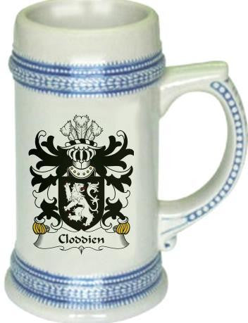 Cloddien Family Crest Stein / Coat of Arms Beer Tankard. We believe our Coat of Arms Steins are of the highest quality anywhere. The glassware quality is very thick and sturdy. The stein feels great in your hand with a very thick handle. Fill this glass with your favorite beer or beverage. keywords: steins, beer, german, glass, glassware, cup, tankard, goblet, family shields, shield, family, genealogy, heraldry, code of arms