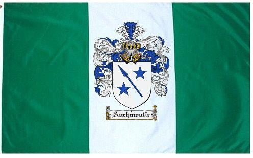Auchmoutie Family Crest Flag / Coat of Arms Flag. You will receive a high quality 3' x 5' Polyester flag with two brass grommets. Proudly display your family heritage with this flag, or hang as a banner on a wall. Our flags make great gifts for birthdays, weddings, anniversaries, fathers day, mothers day, groomsmen gifts, and any other occasion