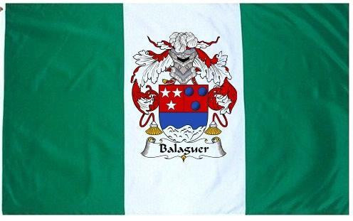 Balaguer Family Crest Flag / Coat of Arms Flag. You will receive a high quality 3' x 5' Polyester flag with two brass grommets. Proudly display your family heritage with this flag, or hang as a banner on a wall. Our flags make great gifts for birthdays, weddings, anniversaries, fathers day, mothers day, groomsmen gifts, and any other occasion
