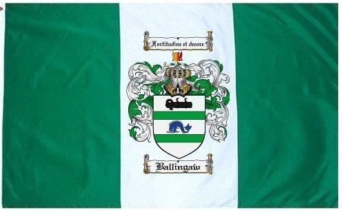 Ballingaw Family Crest Flag / Coat of Arms Flag. You will receive a high quality 3' x 5' Polyester flag with two brass grommets. Proudly display your family heritage with this flag, or hang as a banner on a wall. Our flags make great gifts for birthdays, weddings, anniversaries, fathers day, mothers day, groomsmen gifts, and any other occasion