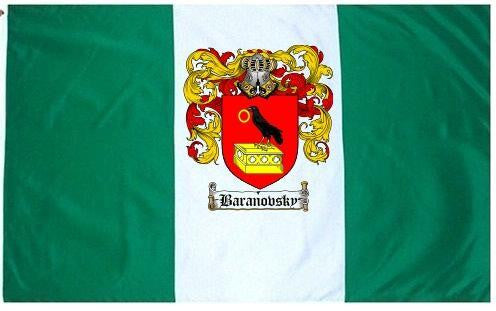 Baranovsky Family Crest Flag / Coat of Arms Flag. You will receive a high quality 3' x 5' Polyester flag with two brass grommets. Proudly display your family heritage with this flag, or hang as a banner on a wall. Our flags make great gifts for birthdays, weddings, anniversaries, fathers day, mothers day, groomsmen gifts, and any other occasion