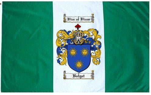 Batget Family Crest Flag / Coat of Arms Flag. You will receive a high quality 3' x 5' Polyester flag with two brass grommets. Proudly display your family heritage with this flag, or hang as a banner on a wall. Our flags make great gifts for birthdays, weddings, anniversaries, fathers day, mothers day, groomsmen gifts, and any other occasion