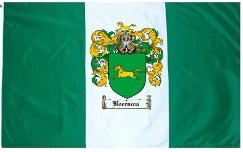 Boersma Family Crest Flag / Coat of Arms Flag. You will receive a high quality 3' x 5' Polyester flag with two brass grommets. Proudly display your family heritage with this flag, or hang as a banner on a wall. Our flags make great gifts for birthdays, weddings, anniversaries, fathers day, mothers day, groomsmen gifts, and any other occasion