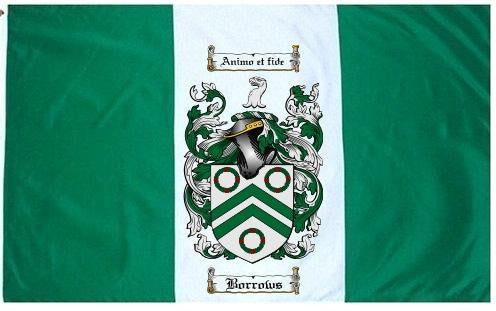 Borrows Family Crest Flag / Coat of Arms Flag. You will receive a high quality 3' x 5' Polyester flag with two brass grommets. Proudly display your family heritage with this flag, or hang as a banner on a wall. Our flags make great gifts for birthdays, weddings, anniversaries, fathers day, mothers day, groomsmen gifts, and any other occasion