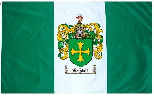 Boydall Family Crest Flag / Coat of Arms Flag. You will receive a high quality 3' x 5' Polyester flag with two brass grommets. Proudly display your family heritage with this flag, or hang as a banner on a wall. Our flags make great gifts for birthdays, weddings, anniversaries, fathers day, mothers day, groomsmen gifts, and any other occasion