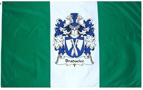 Bradacice Family Crest Flag / Coat of Arms Flag. You will receive a high quality 3' x 5' Polyester flag with two brass grommets. Proudly display your family heritage with this flag, or hang as a banner on a wall. Our flags make great gifts for birthdays, weddings, anniversaries, fathers day, mothers day, groomsmen gifts, and any other occasion