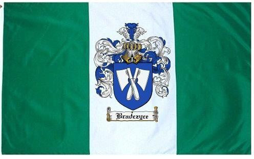 Bradczyce Family Crest Flag / Coat of Arms Flag. You will receive a high quality 3' x 5' Polyester flag with two brass grommets. Proudly display your family heritage with this flag, or hang as a banner on a wall. Our flags make great gifts for birthdays, weddings, anniversaries, fathers day, mothers day, groomsmen gifts, and any other occasion