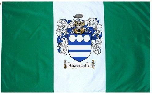 Bradewelle Family Crest Flag / Coat of Arms Flag. You will receive a high quality 3' x 5' Polyester flag with two brass grommets. Proudly display your family heritage with this flag, or hang as a banner on a wall. Our flags make great gifts for birthdays, weddings, anniversaries, fathers day, mothers day, groomsmen gifts, and any other occasion