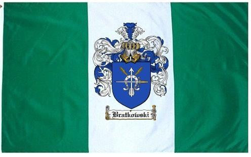 Bratkowski Family Crest Flag / Coat of Arms Flag. You will receive a high quality 3' x 5' Polyester flag with two brass grommets. Proudly display your family heritage with this flag, or hang as a banner on a wall. Our flags make great gifts for birthdays, weddings, anniversaries, fathers day, mothers day, groomsmen gifts, and any other occasion