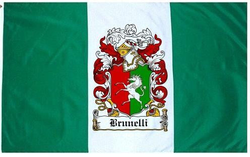 Brunelli Family Crest Flag / Coat of Arms Flag. You will receive a high quality 3' x 5' Polyester flag with two brass grommets. Proudly display your family heritage with this flag, or hang as a banner on a wall. Our flags make great gifts for birthdays, weddings, anniversaries, fathers day, mothers day, groomsmen gifts, and any other occasion