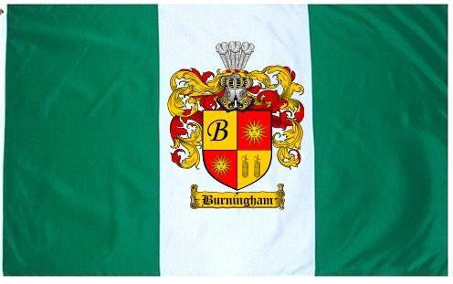 Burningham Family Crest Flag / Coat of Arms Flag. You will receive a high quality 3' x 5' Polyester flag with two brass grommets. Proudly display your family heritage with this flag, or hang as a banner on a wall. Our flags make great gifts for birthdays, weddings, anniversaries, fathers day, mothers day, groomsmen gifts, and any other occasion