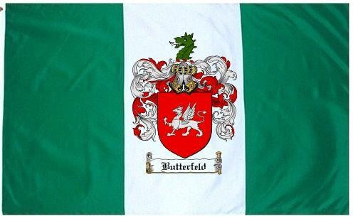 Butterfeld Family Crest Flag / Coat of Arms Flag. You will receive a high quality 3' x 5' Polyester flag with two brass grommets. Proudly display your family heritage with this flag, or hang as a banner on a wall. Our flags make great gifts for birthdays, weddings, anniversaries, fathers day, mothers day, groomsmen gifts, and any other occasion