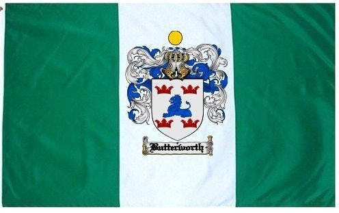 Butterworth Family Crest Flag / Coat of Arms Flag. You will receive a high quality 3' x 5' Polyester flag with two brass grommets. Proudly display your family heritage with this flag, or hang as a banner on a wall. Our flags make great gifts for birthdays, weddings, anniversaries, fathers day, mothers day, groomsmen gifts, and any other occasion