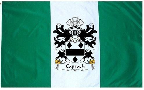 Caprach Family Crest Flag / Coat of Arms Flag. You will receive a high quality 3' x 5' Polyester flag with two brass grommets. Proudly display your family heritage with this flag, or hang as a banner on a wall. Our flags make great gifts for birthdays, weddings, anniversaries, fathers day, mothers day, groomsmen gifts, and any other occasion
