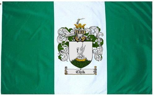 Chik Family Crest Flag / Coat of Arms Flag. You will receive a high quality 3' x 5' Polyester flag with two brass grommets. Proudly display your family heritage with this flag, or hang as a banner on a wall. Our flags make great gifts for birthdays, weddings, anniversaries, fathers day, mothers day, groomsmen gifts, and any other occasion
