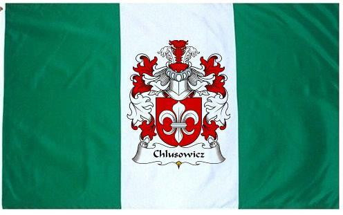 Chlusowicz Family Crest Flag / Coat of Arms Flag. You will receive a high quality 3' x 5' Polyester flag with two brass grommets. Proudly display your family heritage with this flag, or hang as a banner on a wall. Our flags make great gifts for birthdays, weddings, anniversaries, fathers day, mothers day, groomsmen gifts, and any other occasion