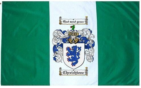 Chreichtone Family Crest Flag / Coat of Arms Flag. You will receive a high quality 3' x 5' Polyester flag with two brass grommets. Proudly display your family heritage with this flag, or hang as a banner on a wall. Our flags make great gifts for birthdays, weddings, anniversaries, fathers day, mothers day, groomsmen gifts, and any other occasion