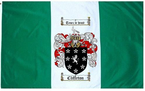 Cliffeton Family Crest Flag / Coat of Arms Flag. You will receive a high quality 3' x 5' Polyester flag with two brass grommets. Proudly display your family heritage with this flag, or hang as a banner on a wall. Our flags make great gifts for birthdays, weddings, anniversaries, fathers day, mothers day, groomsmen gifts, and any other occasion
