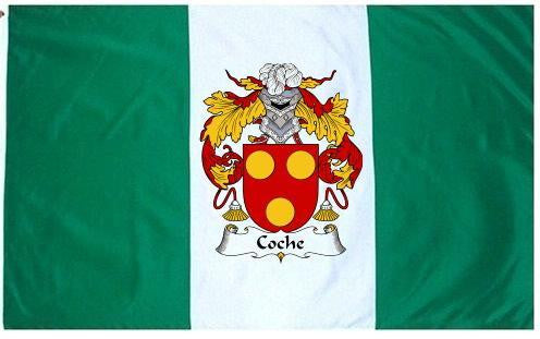 Coche Family Crest Flag / Coat of Arms Flag. You will receive a high quality 3' x 5' Polyester flag with two brass grommets. Proudly display your family heritage with this flag, or hang as a banner on a wall. Our flags make great gifts for birthdays, weddings, anniversaries, fathers day, mothers day, groomsmen gifts, and any other occasion