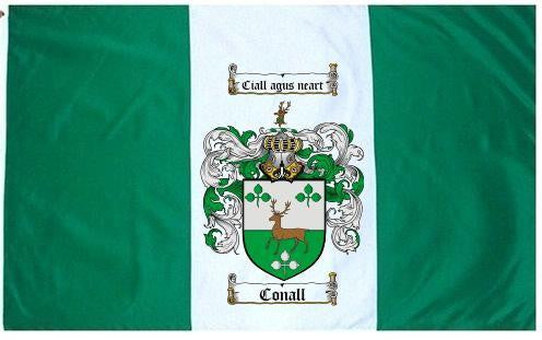 Conall Family Crest Flag / Coat of Arms Flag. You will receive a high quality 3' x 5' Polyester flag with two brass grommets. Proudly display your family heritage with this flag, or hang as a banner on a wall. Our flags make great gifts for birthdays, weddings, anniversaries, fathers day, mothers day, groomsmen gifts, and any other occasion