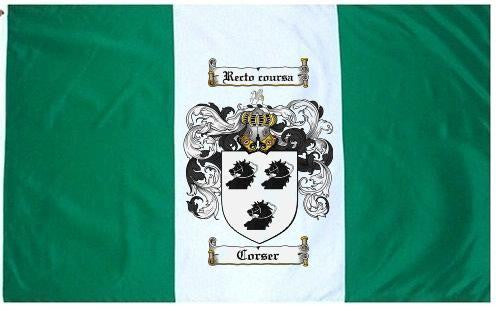 Corser Family Crest Flag / Coat of Arms Flag. You will receive a high quality 3' x 5' Polyester flag with two brass grommets. Proudly display your family heritage with this flag, or hang as a banner on a wall. Our flags make great gifts for birthdays, weddings, anniversaries, fathers day, mothers day, groomsmen gifts, and any other occasion