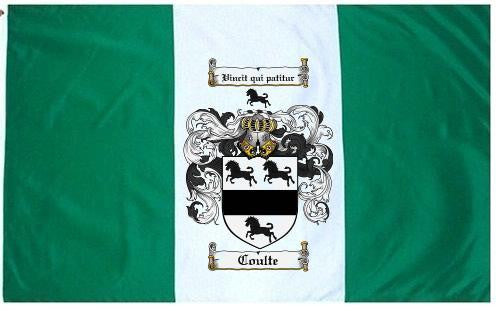 Coulte Family Crest Flag / Coat of Arms Flag. You will receive a high quality 3' x 5' Polyester flag with two brass grommets. Proudly display your family heritage with this flag, or hang as a banner on a wall. Our flags make great gifts for birthdays, weddings, anniversaries, fathers day, mothers day, groomsmen gifts, and any other occasion