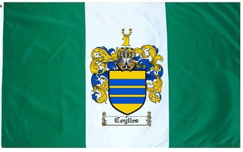 Coylles Family Crest Flag / Coat of Arms Flag. You will receive a high quality 3' x 5' Polyester flag with two brass grommets. Proudly display your family heritage with this flag, or hang as a banner on a wall. Our flags make great gifts for birthdays, weddings, anniversaries, fathers day, mothers day, groomsmen gifts, and any other occasion