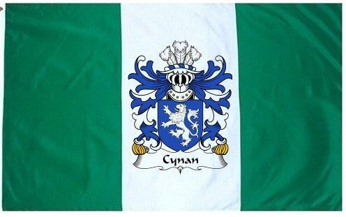 Cynan Family Crest Flag / Coat of Arms Flag. You will receive a high quality 3' x 5' Polyester flag with two brass grommets. Proudly display your family heritage with this flag, or hang as a banner on a wall. Our flags make great gifts for birthdays, weddings, anniversaries, fathers day, mothers day, groomsmen gifts, and any other occasion