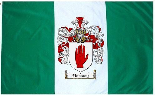 Devanay Family Crest Flag / Coat of Arms Flag. You will receive a high quality 3' x 5' Polyester flag with two brass grommets. Proudly display your family heritage with this flag, or hang as a banner on a wall. Our flags make great gifts for birthdays, weddings, anniversaries, fathers day, mothers day, groomsmen gifts, and any other occasion