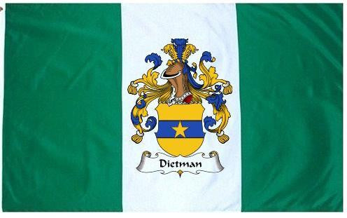 Dietman Family Crest Flag / Coat of Arms Flag. You will receive a high quality 3' x 5' Polyester flag with two brass grommets. Proudly display your family heritage with this flag, or hang as a banner on a wall. Our flags make great gifts for birthdays, weddings, anniversaries, fathers day, mothers day, groomsmen gifts, and any other occasion