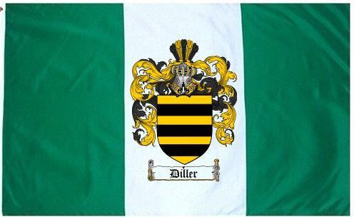 Diller Family Crest Flag / Coat of Arms Flag. You will receive a high quality 3' x 5' Polyester flag with two brass grommets. Proudly display your family heritage with this flag, or hang as a banner on a wall. Our flags make great gifts for birthdays, weddings, anniversaries, fathers day, mothers day, groomsmen gifts, and any other occasion