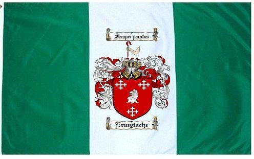 Ermytache Family Crest Flag / Coat of Arms Flag. You will receive a high quality 3' x 5' Polyester flag with two brass grommets. Proudly display your family heritage with this flag, or hang as a banner on a wall. Our flags make great gifts for birthdays, weddings, anniversaries, fathers day, mothers day, groomsmen gifts, and any other occasion