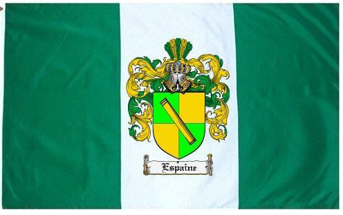 Espaine Family Crest Flag / Coat of Arms Flag. You will receive a high quality 3' x 5' Polyester flag with two brass grommets. Proudly display your family heritage with this flag, or hang as a banner on a wall. Our flags make great gifts for birthdays, weddings, anniversaries, fathers day, mothers day, groomsmen gifts, and any other occasion