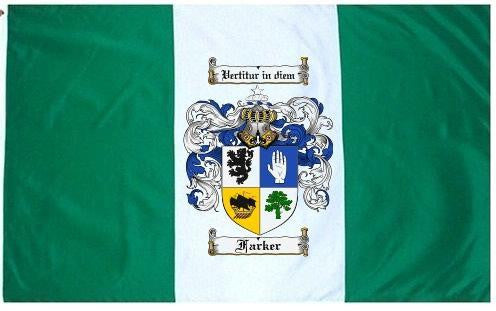 Farker Family Crest Flag / Coat of Arms Flag. You will receive a high quality 3' x 5' Polyester flag with two brass grommets. Proudly display your family heritage with this flag, or hang as a banner on a wall. Our flags make great gifts for birthdays, weddings, anniversaries, fathers day, mothers day, groomsmen gifts, and any other occasion