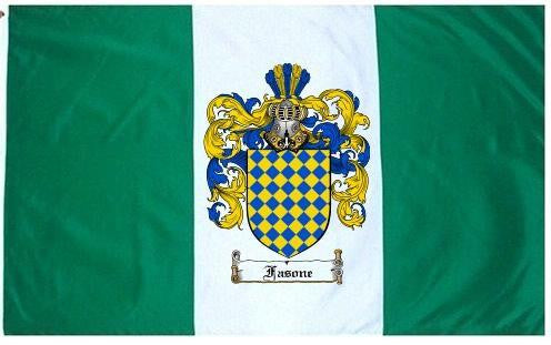 Fasone Family Crest Flag / Coat of Arms Flag. You will receive a high quality 3' x 5' Polyester flag with two brass grommets. Proudly display your family heritage with this flag, or hang as a banner on a wall. Our flags make great gifts for birthdays, weddings, anniversaries, fathers day, mothers day, groomsmen gifts, and any other occasion