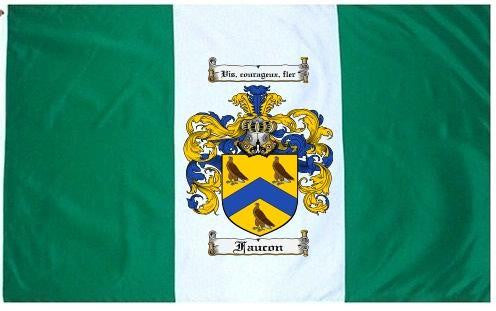 Faucon Family Crest Flag / Coat of Arms Flag. You will receive a high quality 3' x 5' Polyester flag with two brass grommets. Proudly display your family heritage with this flag, or hang as a banner on a wall. Our flags make great gifts for birthdays, weddings, anniversaries, fathers day, mothers day, groomsmen gifts, and any other occasion