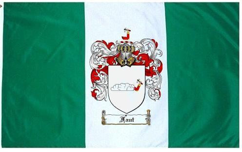 Faut Family Crest Flag / Coat of Arms Flag. You will receive a high quality 3' x 5' Polyester flag with two brass grommets. Proudly display your family heritage with this flag, or hang as a banner on a wall. Our flags make great gifts for birthdays, weddings, anniversaries, fathers day, mothers day, groomsmen gifts, and any other occasion