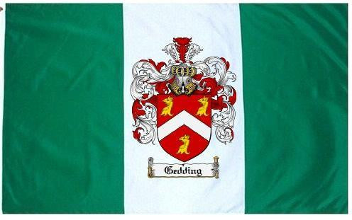 Gedding Family Crest Flag / Coat of Arms Flag. You will receive a high quality 3' x 5' Polyester flag with two brass grommets. Proudly display your family heritage with this flag, or hang as a banner on a wall. Our flags make great gifts for birthdays, weddings, anniversaries, fathers day, mothers day, groomsmen gifts, and any other occasion