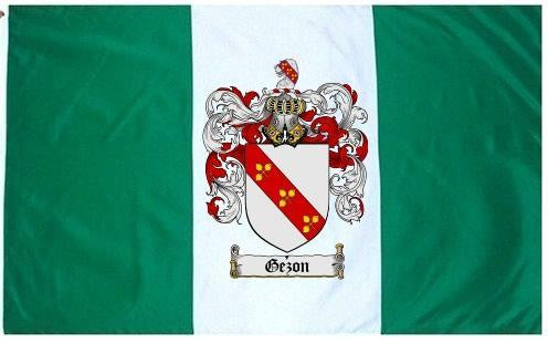 Gezon Family Crest Flag / Coat of Arms Flag. You will receive a high quality 3' x 5' Polyester flag with two brass grommets. Proudly display your family heritage with this flag, or hang as a banner on a wall. Our flags make great gifts for birthdays, weddings, anniversaries, fathers day, mothers day, groomsmen gifts, and any other occasion