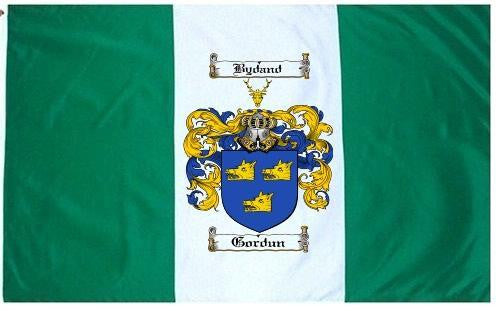 Gordun Family Crest Flag / Coat of Arms Flag. You will receive a high quality 3' x 5' Polyester flag with two brass grommets. Proudly display your family heritage with this flag, or hang as a banner on a wall. Our flags make great gifts for birthdays, weddings, anniversaries, fathers day, mothers day, groomsmen gifts, and any other occasion