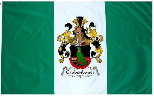Grabenbauer Family Crest Flag / Coat of Arms Flag. You will receive a high quality 3' x 5' Polyester flag with two brass grommets. Proudly display your family heritage with this flag, or hang as a banner on a wall. Our flags make great gifts for birthdays, weddings, anniversaries, fathers day, mothers day, groomsmen gifts, and any other occasion