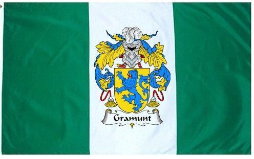 Gramunt Family Crest Flag / Coat of Arms Flag. You will receive a high quality 3' x 5' Polyester flag with two brass grommets. Proudly display your family heritage with this flag, or hang as a banner on a wall. Our flags make great gifts for birthdays, weddings, anniversaries, fathers day, mothers day, groomsmen gifts, and any other occasion