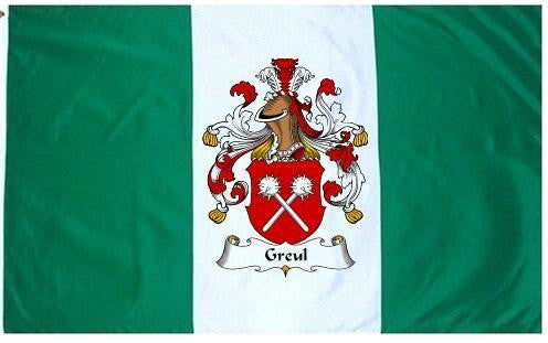 Greul Family Crest Flag / Coat of Arms Flag. You will receive a high quality 3' x 5' Polyester flag with two brass grommets. Proudly display your family heritage with this flag, or hang as a banner on a wall. Our flags make great gifts for birthdays, weddings, anniversaries, fathers day, mothers day, groomsmen gifts, and any other occasion