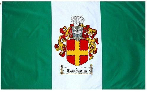 Guadagna Family Crest Flag / Coat of Arms Flag. You will receive a high quality 3' x 5' Polyester flag with two brass grommets. Proudly display your family heritage with this flag, or hang as a banner on a wall. Our flags make great gifts for birthdays, weddings, anniversaries, fathers day, mothers day, groomsmen gifts, and any other occasion
