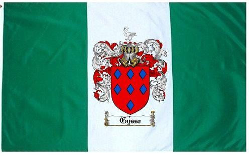 Gysse Family Crest Flag / Coat of Arms Flag. You will receive a high quality 3' x 5' Polyester flag with two brass grommets. Proudly display your family heritage with this flag, or hang as a banner on a wall. Our flags make great gifts for birthdays, weddings, anniversaries, fathers day, mothers day, groomsmen gifts, and any other occasion