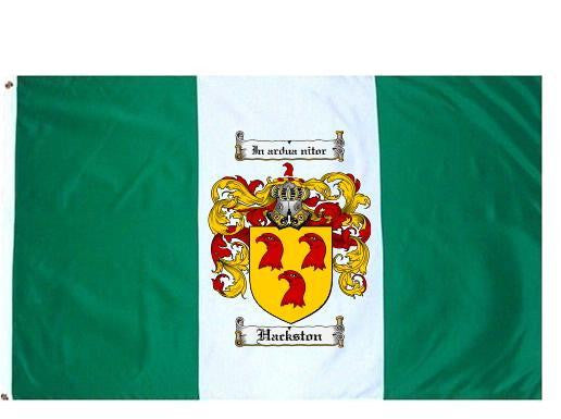 Hackston Family Crest Flag / Coat of Arms Flag. You will receive a high quality 3' x 5' Polyester flag with two brass grommets. Proudly display your family heritage with this flag, or hang as a banner on a wall. Our flags make great gifts for birthdays, weddings, anniversaries, fathers day, mothers day, groomsmen gifts, and any other occasion